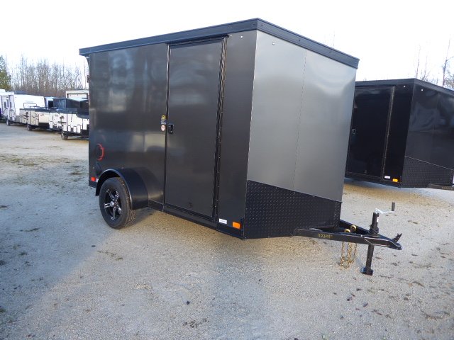 3000 lb Torsion Axle, 15˝ Aluminum Radial Tires, 6’ 6” Interior Height, 2” Coupler with Manual Jack, Flat 4 Plug, 24” V-Nose with Slant, Slant Cut Stone guard, 16˝ On-Center Walls, Ceiling & Floor, 3” Tube Frame, Fold-Down Rear Jacks, Flow-Thru Vents, 3/8” Plywood Walls, 3/4˝ Plywood Floor, 4-Bolt-in D-Rings, 1-12 Volt Dome Light With Switch, LED Exterior Lights, .030 Taped Exterior, One Piece Aluminum Roof, Aluminum Holdbacks, 2” Corner Posts, 32” x 72” RV Side Door, Colour Gray