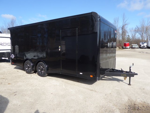 Ramp Door W/ Beavertail, Third Member, 7’ Interior Height, 2-5/16” Coupler, Top Wind Jack w/ Foot Pad, 5200LB Torsion Axle, 16” Black & Silver Aluminum Wheels, 16” On-Center Wall posts, Roof Bows & Floor joists, 3/4” Plywood Floor, 32” x 72” RV Side Door, Roof Vent, 3/8” White Vinyl Walls, 4 Heavy Duty D-Rings, 2 Interior Lights W/1 Switch, Stone Guard, LED Tail/ Clearance Lights, Rear Wing, Spare Tire Well, One piece Aluminum Roof, 32” Side Door