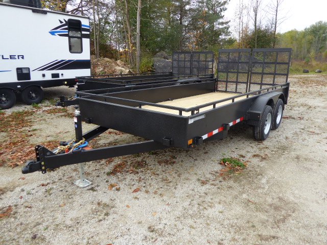 2026 Canada Trailer, UT 7×16, (2) 3500lbs Axles with Easy Lube Spindles, Slipper Spring Suspension, 15” Radial Tires, 2-5/16” Coupler or 3” Lunette Eye, 2000lbs A Frame Jack, 14” Solid Steel Sides + 3” Tie Rail, 4’ Split Ramps with Mesh, Pressure Treated Wood, Stake Pockets, (6) Welded In D-Rings, Spare Tire Mount, Transport Canada & D.O.T. Approved, Sealed Beam, L.E.D. Lights, 7-Way RV Plug, Power Coat + Scorpion Stone Guard, Registration and Plate Included.